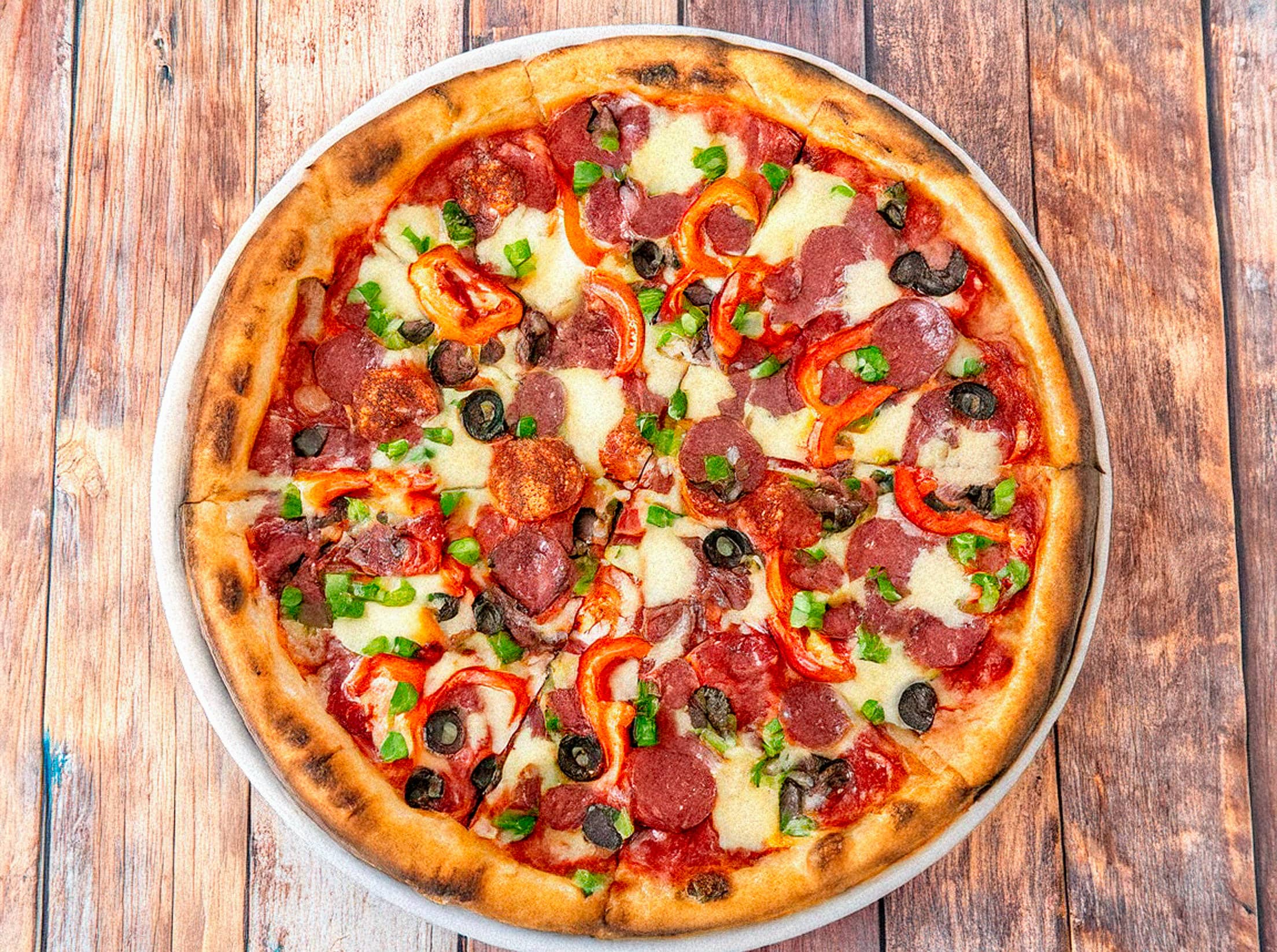 A crowd favorite loaded with sausage, pepperoni, ground beef, bacon, mushrooms, olives, peppers, and more all on a hearty double-dough crust.
