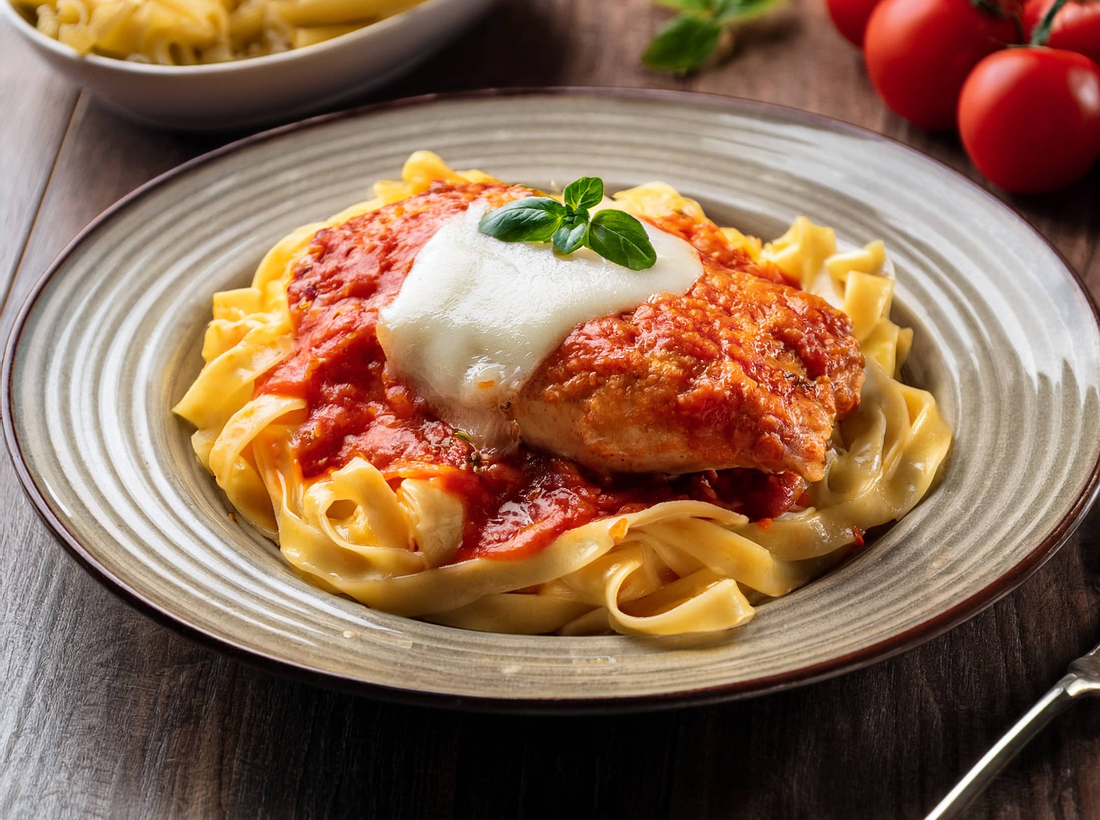Breaded chicken breast topped with marinara and melted mozzarella, served over fettuccine for a hearty Italian favorite.