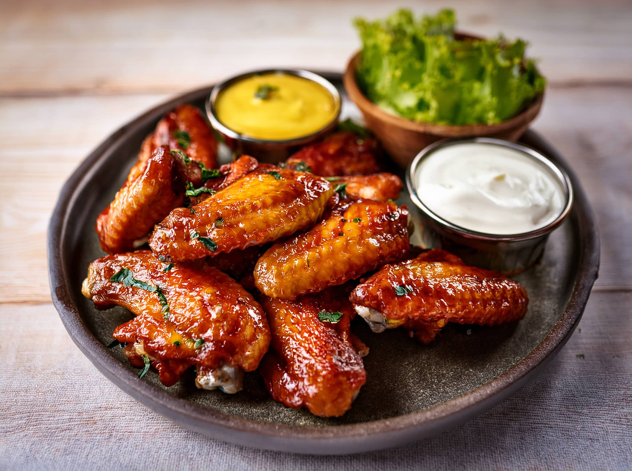 Available in Buffalo, BBQ, Garlic Parmesan, and Mango Habanero—served with ranch or blue cheese, perfect for game nights or sharing.