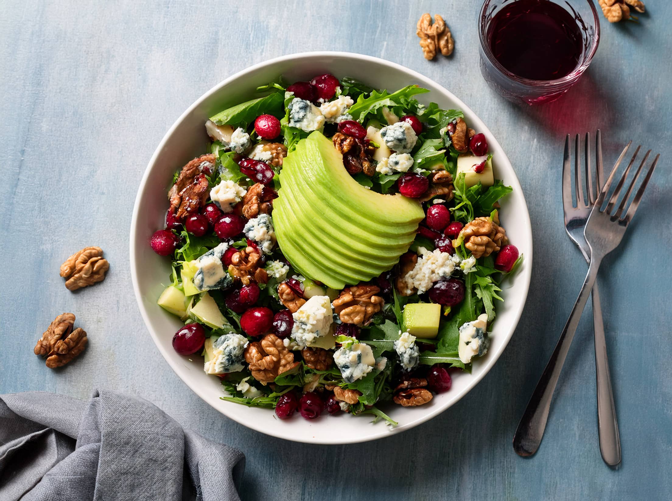 A refreshing mix of greens, apples, walnuts, avocado, cranberries, and gorgonzola, topped with Sweet Red Wine dressing.